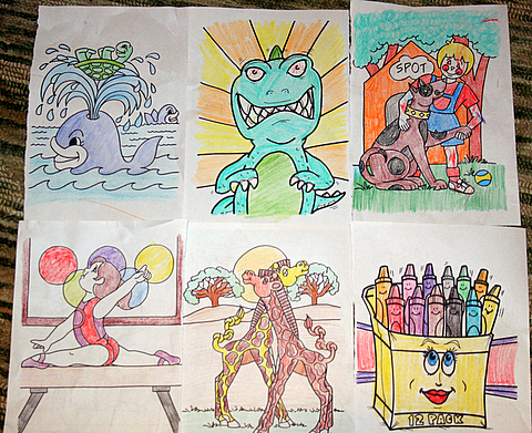 Coloring is one of the few things my kids do that I thoroughly enjoy as well. But to “kick it up a notch”, why not make up really funny titles for the pictures you color? Let me give you a few examples. Here are all the pages I colored last night. Clockwise starting at the top left: