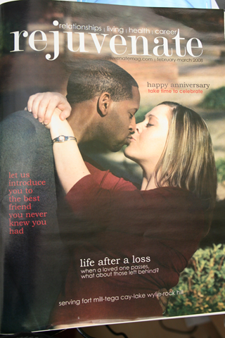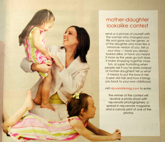 That really happened to me this week. Heather and I are standing in the aisle at CVS and she’s flipping through the new Rejuvenate magazine and was all, "Hey, that’s you!"  If you didn’t know, my friend is (was) the editor of the magazine and asked me and the girls to be in the second issue last year.  This is the same picture as one in the first magazine so I guess they just used it.  No one even told me to expect it.  Fine with me though, I’ll take a celebrity moment as a surprise.
