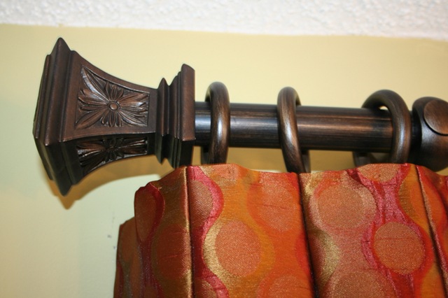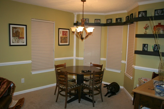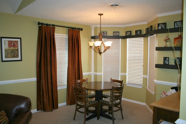 I FINALLY got some curtains up in my dining room. Mom owns a business selling them and custom blinds so you would THINK I would have them as soon as we moved in but no. And it’s not her fault either. I am so flighty and indecisive when it comes to curtains. I think it’s because I’ve been around it my whole life and I know all the options. Of course, my mom and sister do too and I don’t think they are nearly as bad as me. I think I’m just one of their "bad" customers. It took FOREVER to pick the fabric out and literally months to decide on the hardware. I didn’t get great pictures, but here you go.