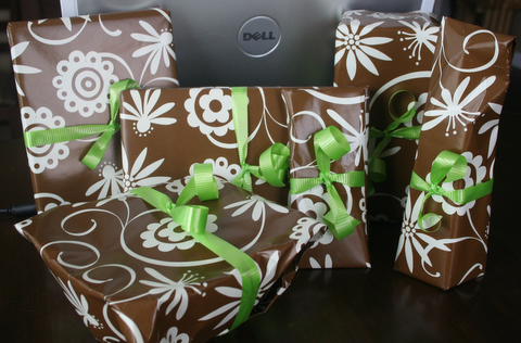 Alrighty, folks. Laura and I are both ready to ship our packages and I am SO EXCITED. Both for her to get this and to get what she sends. Even from the packaging, you get a taste of my favorite things…I love brown and lime green! No, I’m not the best packaging person ever but I think the paper is cute (and free thanks to Walgreens! ahem, Laura, you didn’t hear that). I had one item that I wanted to get but it just didn’t work out but every item is something that I love. Some new, some old favorites. The next time you’ll see these things, they’ll be unwrapped and pictured on Laura’s blog! I can’t wait!