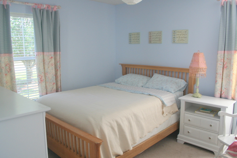 Just a side note we rode to the furniture store THREE times this weekend..and it’s 45 minutes away. We went Friday night and picked it out, not taking a truck so we could all ride together. Saturday morning Scott went while I was at bible study to pick it up. When I got home and he got the bedside table out, it had glue stuff on it so we had to go BACK to exchange it. 4.5 hours of driving for these pieces. But it’s really looking like a little girls’ room now! Mom is going to make a dust ruffle and pillow shams and I’m going to get a print of their tea party and put it on the wall as well.