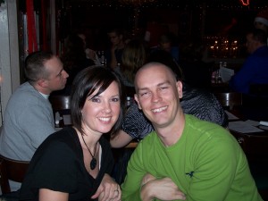 • Saturday we slept in, took the kids to choir practice, cleaned, ran some errands, took the kids to a play date and then spent Saturday evening over at Jaynee‘s house for their White Elephant Exchange.  They snapped one picture of us there.  We had a good time talking to a few people we’ve seen the past two years and also meeting some new people.  And of course, the food was delish.  Oh, and we came home with a fondue set and some handmade potholders.  Two of the better gifts there!