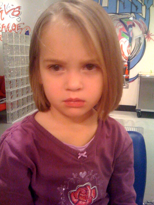 So, all is done.  She absolutely loves it.  I think it’s really, really cute although I almost cried when I find out and I still look at her missing her hair.  Lexi’s hair has always, always been her trademark.  I keep thinking about her in her pageant dress with her long pretty hair and all the times people comment “look how long her hair  is”.  I’ll miss running my fingers through when she’s sleepy and putting her to sleep and watching her swipe it to the side when it’s in her way or pulling at the back of it to get it out of a shirt.  I KNOW it will grow back but it’s just different now.  I don’t love her any less or think she is any less beautiful.  I just wasn’t ready to give my baby’s long hair up yet.  Anyhow, that’s my Mommy sad rant.  Here she is as soon as she got it done.