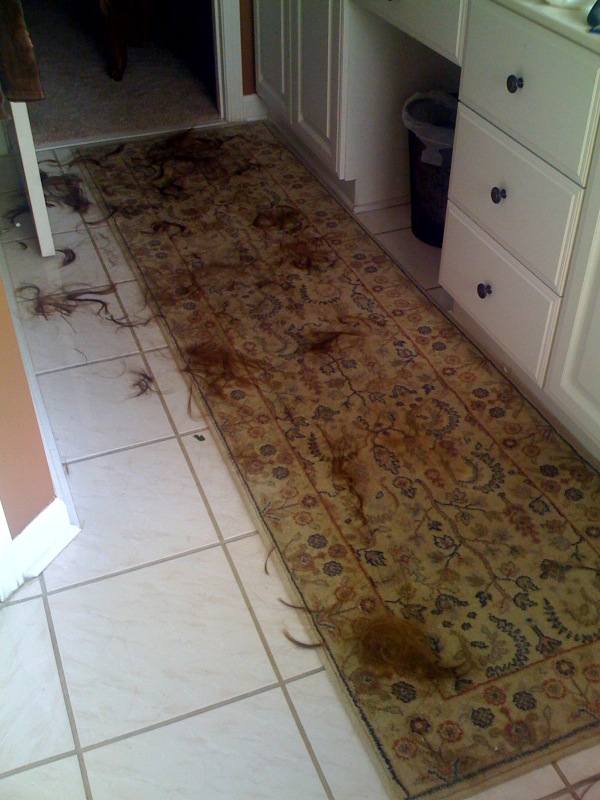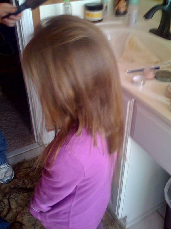 Then the emails and phone calls started.  And of course I chose today to go into the office.  The story as I think I finally understand it is Lexi and her friend that lives across the street from Mom were playing dress-up in Mom’s walk-in closet which is located in her bathroom.  Heather had just checked on them but apparently they had decided to have a fashion show and had gone in Mom’s bathroom drawer and gotten her scissors out and wanted new hair cuts for their fashion show.  Mom first finds the “slaughter house” of a bathroom floor full of hair and then finds the girls hiding in her clothes.  They come out flipping their hair saying their having a fashion show!  They are excited about their hair!  Poor M, she has taken chunks out of her hair up to her scalp in some places.