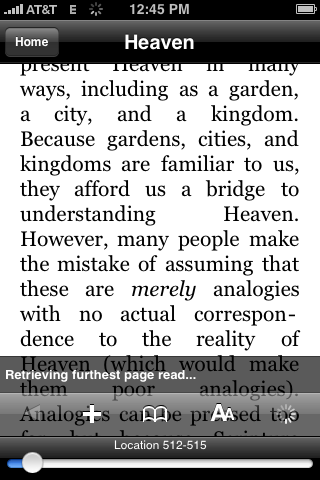 Kindle. One of my newest apps. This one is worthy of a little explanation. Amazon.com put out a book reader named the Kindle. It’s basically another electronic device. It’s about the size of a book and you buy and download books onto the device for reading. Save the trees! The Kindle iPhone app is basically just an app on the iPhone where you can download and read books. So far I’ve only downloaded one book but it does take up screentime.