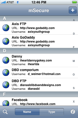 mSecure. As one of my latest purchases, it’s quickly becoming my favorite. mSecure stores all your site, user ids and passwords. I have a lot of them and I’m beginning to lose track. It’s so easy to pull this app up and find my password!
