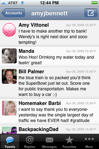 Tweetie I probably spend most of my time on Tweetie, the app for Twitter. I check it first and last thing. I love that Tweetie is fast and I can check all my accounts. And of course I Twitter my own Tweets!