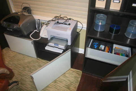 Scott worked really fast and hard to get it all put together. We realize though that the two smaller cabinets we bought to go on top of the big ones in order to make it a floor to ceiling cabinet would just be overwhelming. So we decide to put them side by side and create another sideboard cabinet to store the kids’ art stuff and we’d get rid of that plastic drawer set. He had to get up early to get those cabinets put together and I didn’t reorganize all that until late this evening.
