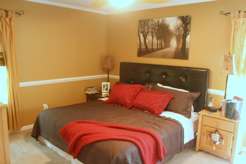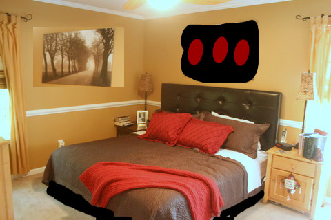 • My main concern was that plain wall to the side.  She suggested another large piece of art.  It looks small in the pic, but that is a King size bed.  My mom suggested I move the neutral tree picture to the side wall and then get another picture that is neutral and maybe a hint of red in it for above the bed.