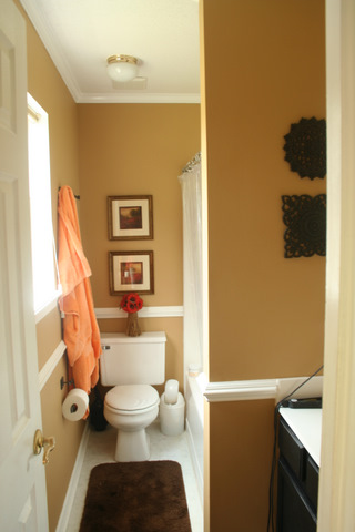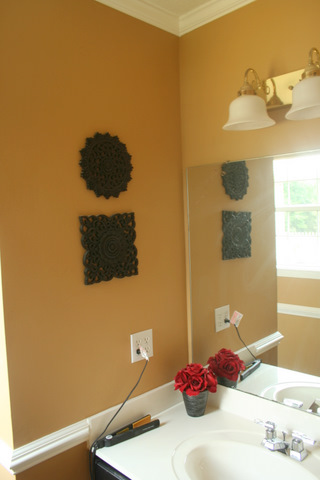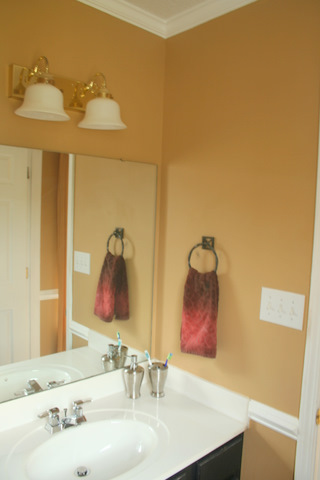 For the first time maybe ever, someone scared me with a wall color. I really wish I had on film my reaction to her suggestion to paint the bathroom…..RED.  Red is a very tricky wall color.  It can go orange.  It can look messy around the trim.  It can be loud.  It makes a statement.  BUT.  What I asked for in that bathroom was something bold.  I wanted it to be spa-like.  I wanted it fancy.