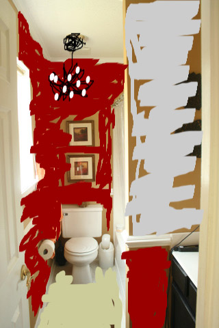 • Put a iron/clear glass chandelier above the toilet area.  (that was my idea, yay amy)