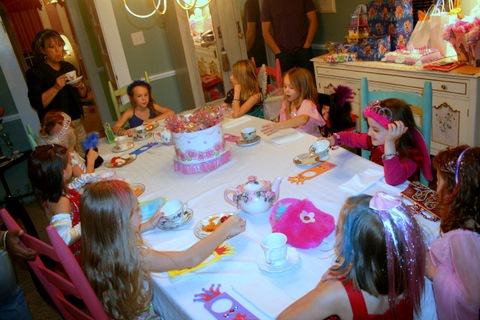 And no I’m not talking politics! The girls had their combined birthday tea party with their friends last night. They had 7 friends join them at the Celebration Cottage at Miss Libby’s for crafts, dress-up, tea and of course cake and presents! This was a great birthday year. All the girls were old enough to be left without parents and had a blast together on their own. You can imagine that 9 girls 5-7 would be almost uncontrollable in a full room of dresses, shoes, gloves, wands, fans, hats and purses. And an entire other room with jewelry, make-up and hair accessories. And while they were somewhat controllable, they were pretty excited.