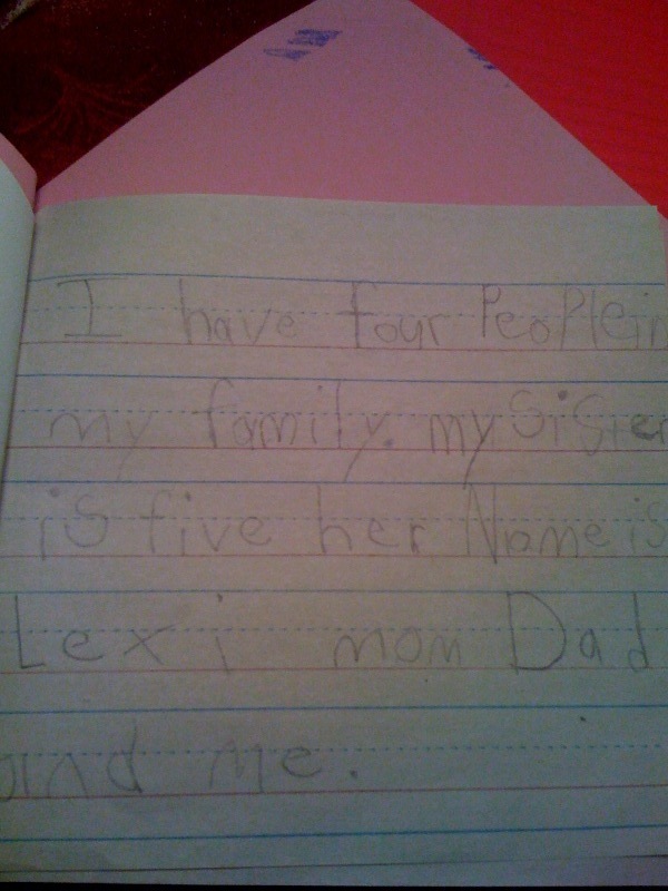“I have four people in my family. My sister is five her name is Lexi mom Dad and me.”