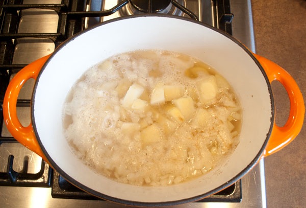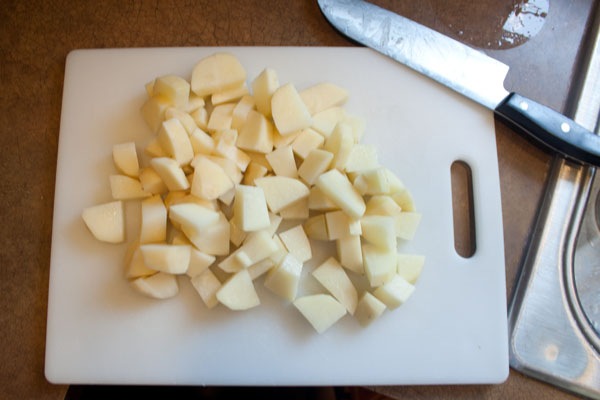You start by peeling and cubing one potato per person. I find that two large potatoes will actually feed the four of us.