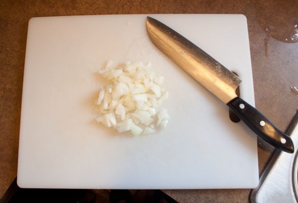 Chop 1/4 cup of onion per person and add to the potatoes. I find that one small onion is perfect for two people.