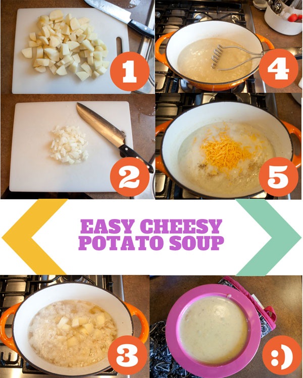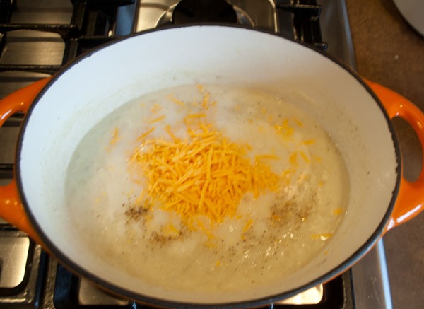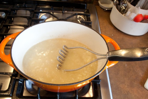 Smash the potatoes, leaving chunks. How much you mash is really up to your texture preferences. My kids don’t like big lumps in their soup so I mash mine into small chunks. Don’t mash too much, though, or you’ll have runny mashed potatoes.