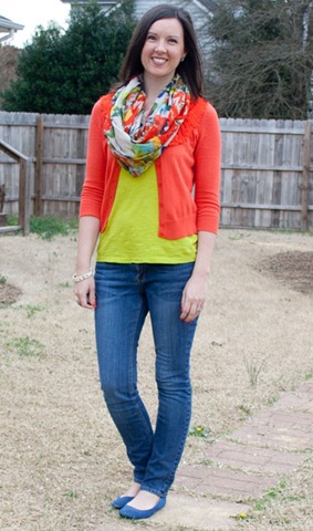 Darling outfit! Love that you put a bright scarf with a bright sweater!
