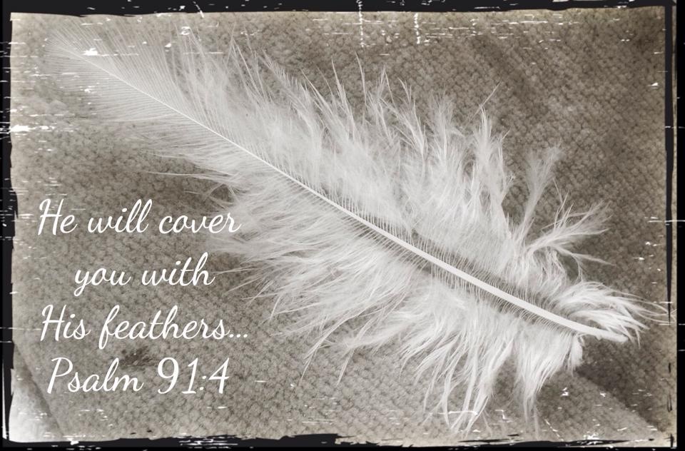 Saturday afternoon after my mom passed, I asked my friend Crystie if she would run to Bath & Body Works to grab me some candles. (She had asked God for a feather… But didn’t get one) she asked God again for a feather even if it’s just for Lynn… And as she came out to get into her car… There in a puddle was a WHITE feather. All of my others had been dark. She grabbed it up and brought it to me. Crystie used her white feather to create a picture with a scripture reference on it… Psalm 91:4, “He will cover you with His feathers”… (A coworker shared this exact scripture with me on Friday after hearing this story). I had those printed and framed for my family.