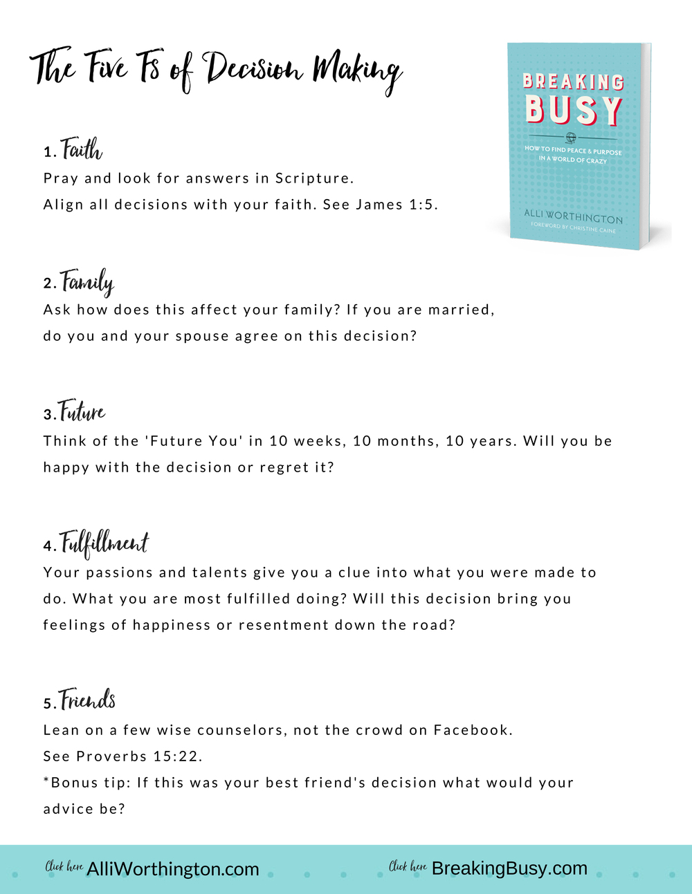 Alli Worthington is an author, speaker, blogger, and the Executive Director of Propel Women, an organization that empowers female leaders. Her goal is to help women live the life they were created to live. Alli co-founded BlissDom Events and has helped individuals, small business owners and Fortune 500 companies be more successful. Alli’s no-nonsense, guilt-free take on motherhood, parenting and balance has led to appearances on TODAY and Good Morning America. She lives outside Nashville with her husband, Mark, their five sons, rescued dog and cat who moved onto their doorstep.