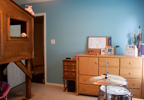 So, here’s the big debate in our house. Is the blue wall too much of a feminine blue? (And please, that is not an invitation to give me a lecture about reinforcing gender stereotypes, okay? Okay. I mean, I did have my daughter in a blue room with tree house bed which isn’t traditionally feminine. Anyway. Okay.)