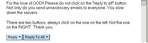 So we had a person at work today that emailed a very large distribution list…like probably a hundred or several hundred people on it. Apparently the list was alot large than it needed to be and several people kept emailing the entire list to say they wanted removed from the list. People start emailing the entire list to say quit emailing the entire list. One guy finally emails this to the entire list.