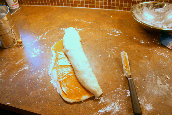 You don’t want the peanut butter very thick because it will be messy when you roll it up. I think I could have done this layer of peanut butter just a tad thicker. But I can never get enough peanut butter so there’s that. Ok. Now carefully roll up the dough like a cinnamon roll.