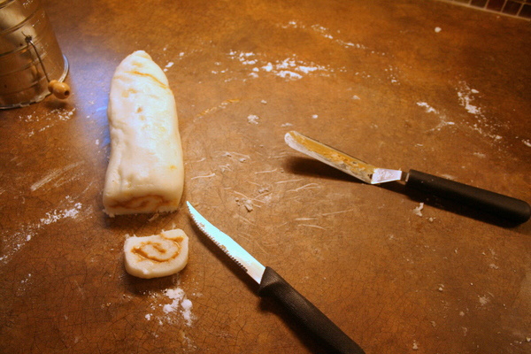 At this point, you can cut the roll in half and put it in a gallon plastic bag or wrap it in wax paper and then put it in the fridge to harden. Once it’s set about an hour or two later, take it out and cut it in 1/2” thick slices. And bam! Potato candy. Clearly I couldn’t wait to taste it.